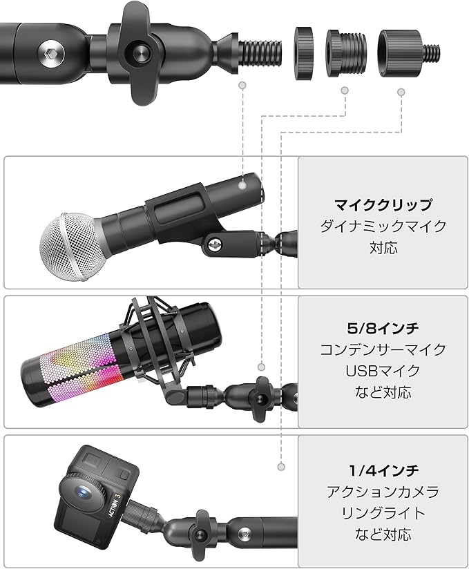 【幅広く機器が対応】1/4"、3/8"、5/8"インチの変換ネジとマイククリップが同梱され、ダイナミックマイク、コンデンサーマイク、カメラ、LED撮影ライトなど、様々な1/4"、3/8"、5/8"に対応可能です。 マイククリップの直径は3∼5cmで、サイズに合うマイクを差し込んで取り付けできます。