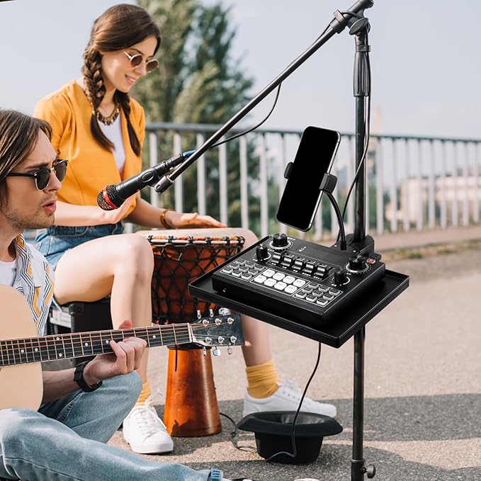 携帯電話ホルダー付きマイクスタンドトレイ 27 x 20.5cm カニクランプ付き大型トレイホルダー ステージ、ライブストリーミング、コンサートパフォーマンス、カラオケ用のほとんどのマイクスタンドに対応