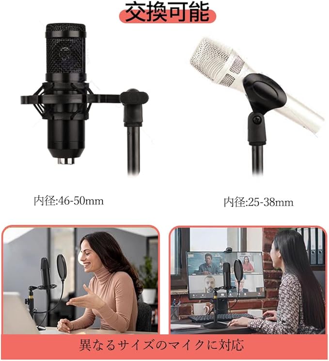 【オールインワンコンボ】調整可能なデスクマイクスタンド、ショックマウント、二層ポップフィルター、スクリューアダプター、マイクロフォンクリップが含まれています。