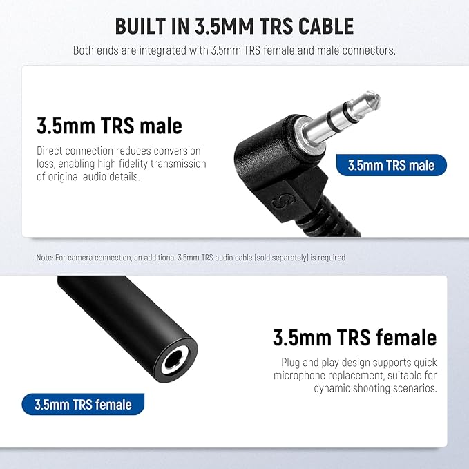 【3.5mm TRSケーブル内蔵】3.5mm TRSオス-メスケーブルが内蔵されており、マイクとカメラ/ビデオカメラの接続が簡単です。オスコネクタをマイクに、メスコネクタをカメラに接続します。ご注意: カメラ接続には、3.5mm TRSオーディオケーブル(別売)が必要です。