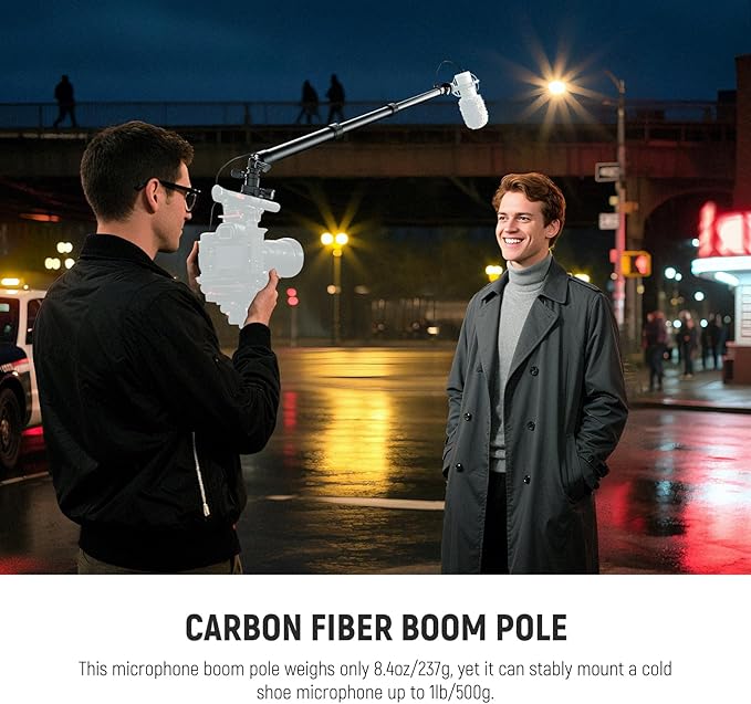 【カーボン製ブームポール】マイクブームポールはカーボンで作られ、軽量ながらも頑丈で、わずか237gという軽さであり、最大500gまでコールドシューマイクを安定して取り付けられます。NATOクランプはカメラケージに素早くしっかりと固定し、マイクをフレームから遠ざけ、インタビュー、映画制作、Vlog撮影など、一人で行う撮影に最適です。