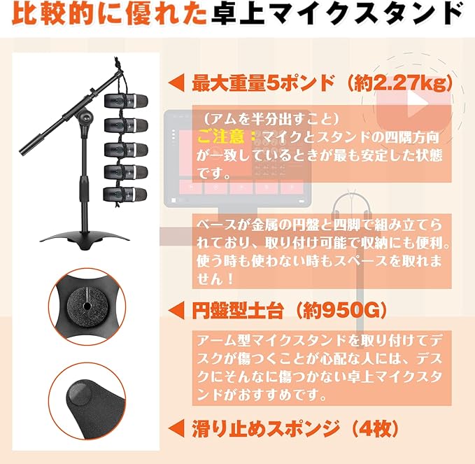 【パッケージ内容&安心な対応】:マイクスタンド本体X1(高さ:220-335mm)ブームアーム(長さ:366mm)、差し込む式ホルダーX1、ケーブルホルダーX1、土台X1(190 190mm 重さ:950g)⅝スレッドX1 。 商品に問題があった場合は、弊社までご連絡いただき、迅速に対応させていただきます