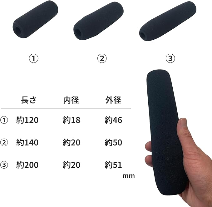 【バリエーション】S:長さ120mm 幅46mm 内径18mm M:長さ140mm 幅50mm 内径20mm L:長さ200mm 幅51mm 内径20mm 【内容品】マイクスポンジ2本セット【カラー】ブラック※購入時はサイズを十分にご確認の上、お買い求め下さい。
