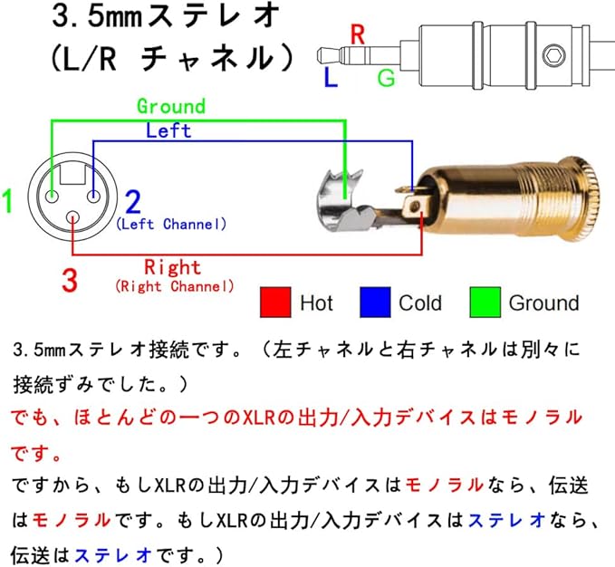 この 3.5mm xlr ケーブル は ステレオ接続です。でも、ほとんどの一つのXLRの出力/入力デバイスはモノラルです。ですから、伝送がモノラルか、ステレオかは、XLRのデバイス次第です。3.5mm xlr 変換 xlr 3 to 3.5 mm ケーブルは 3.5 mm ステレオミニプラグメスを持つ機器とXLRオスを持つ機器の接続に最適な 3.5mm メス xlr オス ケーブル で、3.5 mm メス 3 極 変換 キャノン ケーブルです