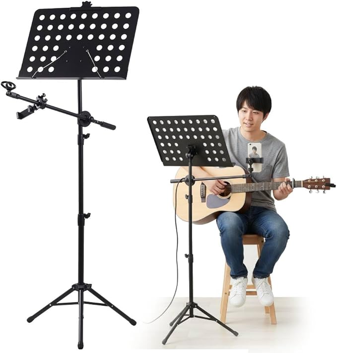 譜面台としてはもちろん、マイクの設置やスマートフォンの固定にも対応した、一台三役の多機能スタンドです。