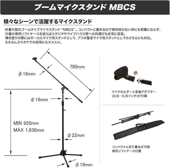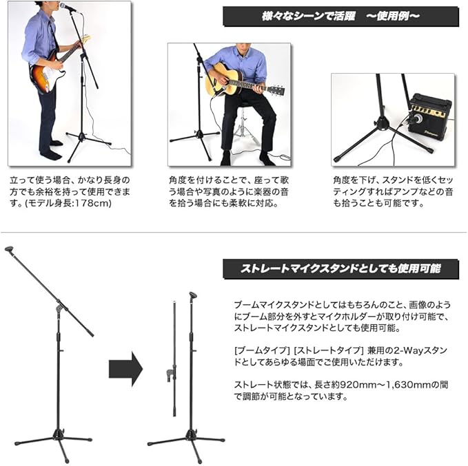 ■ストレート部:920~1630mm ■ブーム部:長さ805mm ※マイクホルダー付属(約直径2.5cmまでのマイクに使用可)