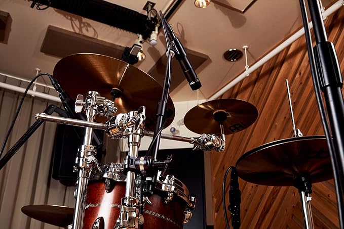 ボーカル用のマイクスタンドにアコースティックギター用のマイクを追加したり、スネアドラムのトップ/ ボトムをねらう2本のマイクを1本のマイクスタンドで