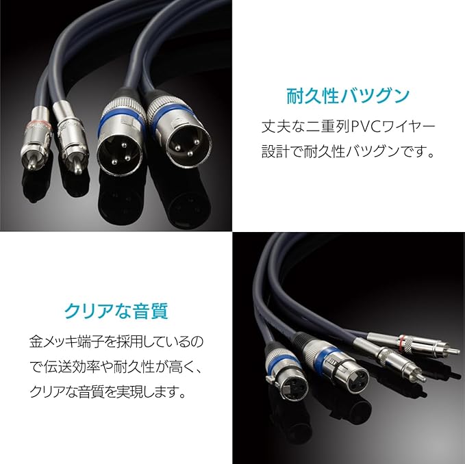 互換性に優れた2XLR、2RCA変換ケーブルです。オーディオ機器やアンプ、マイクミキサーなど幅広い機器でご使用いただけます。