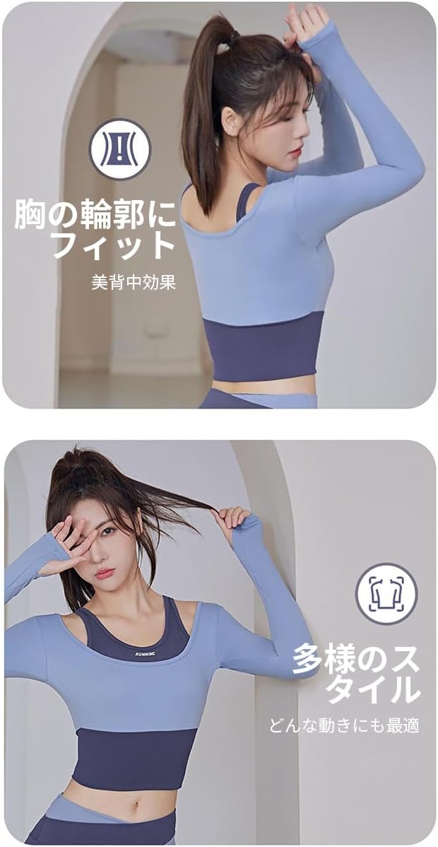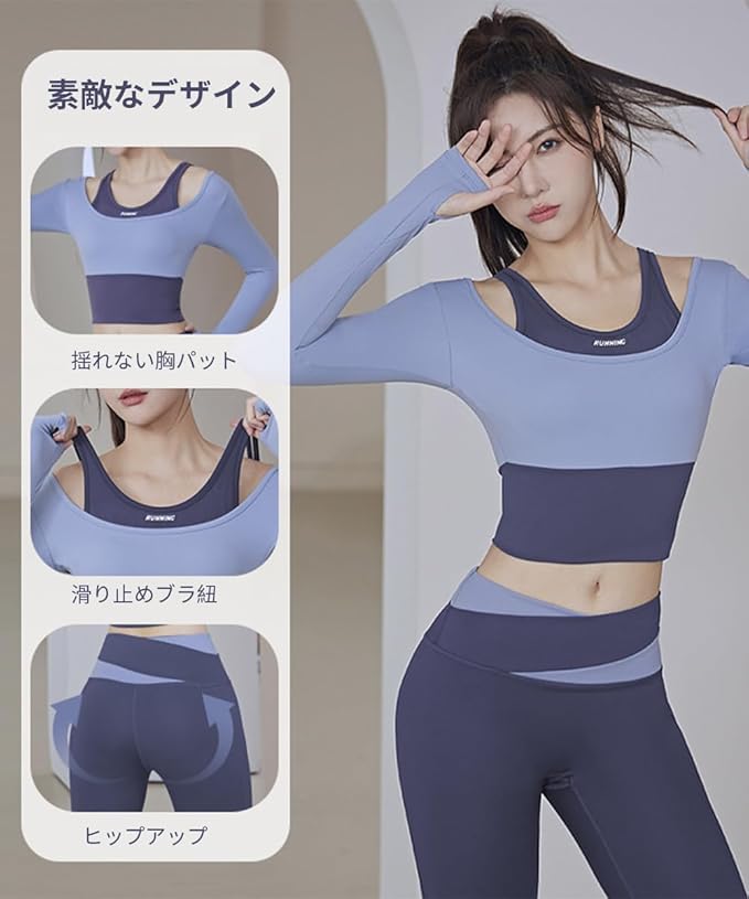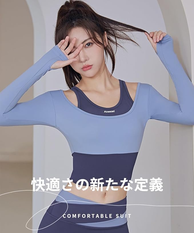 [Karsaer] ヨガウェア スポーツウェア レディース フェイクレイヤード 長袖 ヨガウェア上下セット おしゃれ 通気性 伸縮性 吸汗速乾 トレーニングウェア カップ付き ヨガの服 レディース ジムウェア A8126