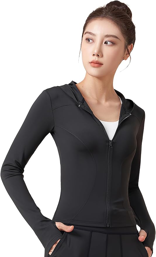 [MORGEN SKY] スポーツウェア ヨガウェア トップス レディース フード付き 長袖 ウエスト丈 ヨガシャツ ジャケット フルジップ 指穴付き パーカー ジップアップ フィットネス トレーニング 春 夏 秋 おしゃれ ロングスリーブ WT43 | peaceFull store