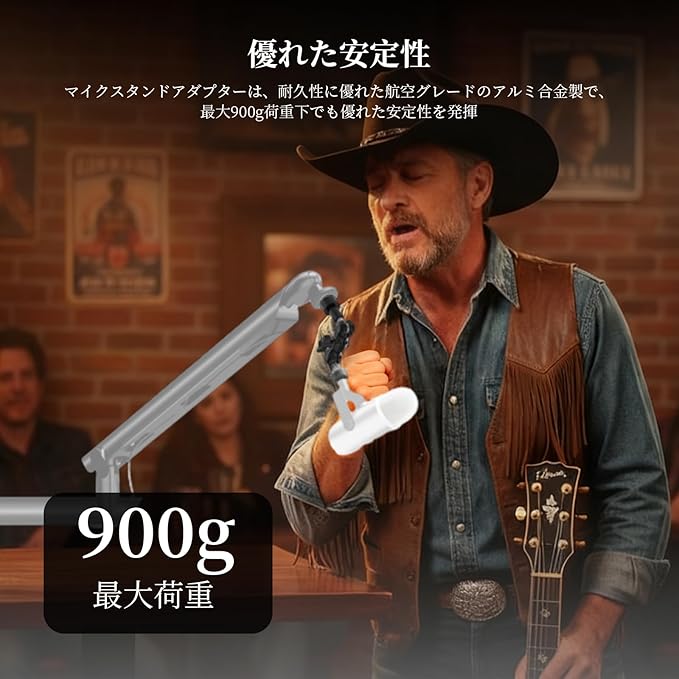 【アルミ合金製】マイクスタンドアダプターは、耐久性と耐錆性に優れた航空グレードアルミ合金で作られ、荷重下でも優れた安定性を発揮し、最大荷重は900gです。
