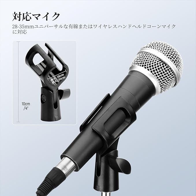 【幅広い互換性】マイククランプには、3/8" to 5/8"までネジアダプターが2つ付属しており、28mm-35mmまでユニバーサルな有線または無線ハンドヘルドコーン型マイクに対応します。