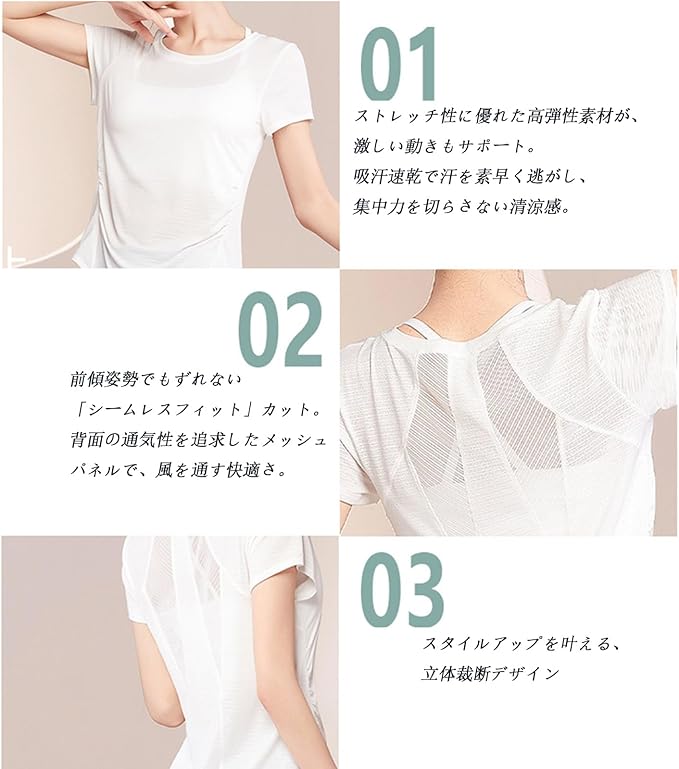 [GOLDENMUGI] Tシャツ レディース 半袖 インナーシャツ クルーネック トップス 無地 トレーニング T-シャツ ヨガウェア 春 夏