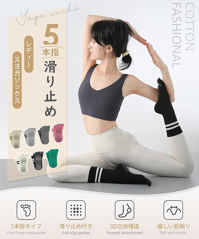 [YUMISS] ヨガソックス 滑り止め 5本指 ヨガソックス ピラティス靴下【通気性のよい綿素材・指先が自由に動き】 ヨガ靴下 レディース 快適 抗菌消臭 蒸れにくい 冷房対策 22.5cm~25cm スポーツウェア ヨガ ピラティス トレーニング スポーツ | peaceFull store