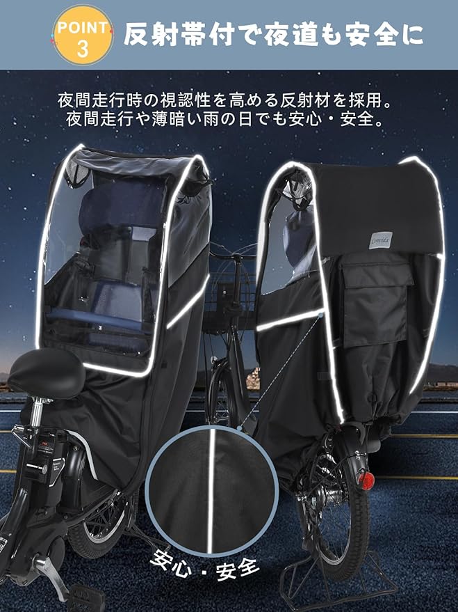 【らくらく乗せ降ろし&反射素材】:カバーの正面・側面が大きく開くことができるので、お子様の乗せ降ろしが楽々に。また、夜間走行時の視認性を高める反射材が採用されました。夜間走行や薄暗い雨の日でも安心・安全です。