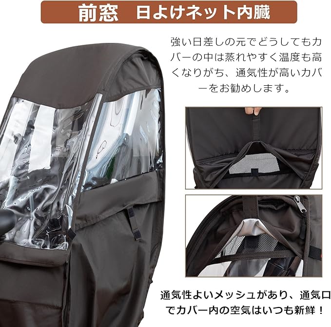 【優れた通気性と日よけ機能】強い日差しの下ではカバー内部の蒸れと高温が課題ですが、本品は通気性の高いメッシュ素材を採用しています。特に前面には日よけネットが内蔵されており、直射日光を遮りつも、随所に設けられた通気口からしっかりと空気の流れを生み出します。これにより、カバー内部は常に新鮮な空気が循環し、お子様が快適に過ごせる涼しい環境を維持します。単なる日よけではなく、風通しを考えた設計が特徴です。