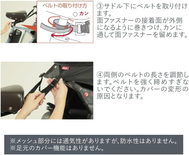 メッシュ部分には通気性がありますが、防水性はありません。※足元のカバー機能はありません。