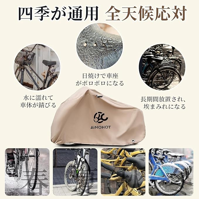 自転車カバー 防水 厚手 日焼け防止/防雪/霜防止 全被り 破れにくい 高耐久 雨避けカバー 盗難防止ロック穴付き 防風&防塵 耐熱 UVカット 電動自転車対応 210Dオックス製 バイクカバー 収納袋付き ベージュ
