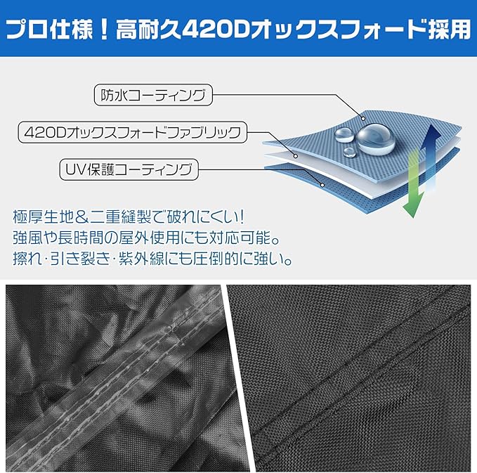【420D厚手・破れにくい高耐久設計】 この自転車カバーは420Dオックスフォード布を採用し、210Dや300Dを超える耐摩耗性・引裂強度を実現。屋外駐輪場での風雨や紫外線にも強く、日常使いはもちろん、雨の多い季節やアウトドア・防災備品としても最適です。電動自転車など重めの車体にも対応できるタフ設計。