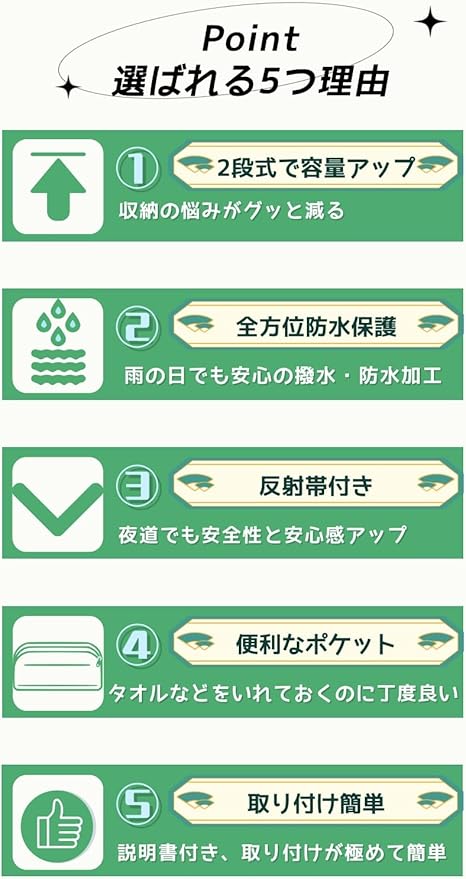 【便利なポケット付き+簡単取り付け】自転車まえかごカバーの前面に小さなポケットが付いているので、雨を拭く為のハンカチなどを入れておくと、サッと取り出す事ができます。取り付けが極めて簡単です。カバーを自転車かごに被せて、ヒモで留めるだけで簡単に取り付けられます。