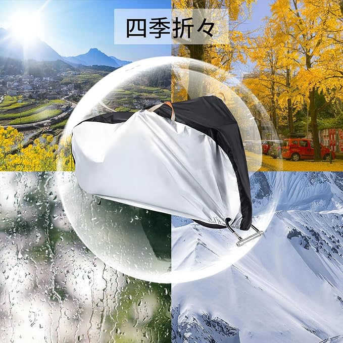 【高耐久性】自転車カバーは本織りグレードの210D牛首布で作られ、0.8mm厚、破れにくい、50%高い経年強度、PUコーティングと銀膜防汚層はUPF50+防汚性能と3000mm防水性能を提供します。大雨、直射日光、霜、砂から愛車を守ります。