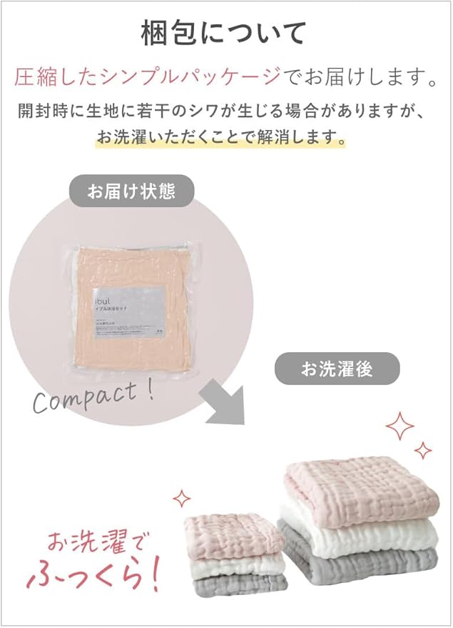 【綿100%&蛍光増白剤不使用】ふんわりやさしい6重ガーゼ。大切な赤ちゃんに使うものだから、柔らかく心地よい肌ざわりにこだわりました。産後で敏感になっているママのお肌にもお勧め。家族みんなでお使いいただけます。素材は、もちろん綿100%。ホワイトも蛍光増白剤を使っていない自然なカラーなので安心してお使いいただけます。