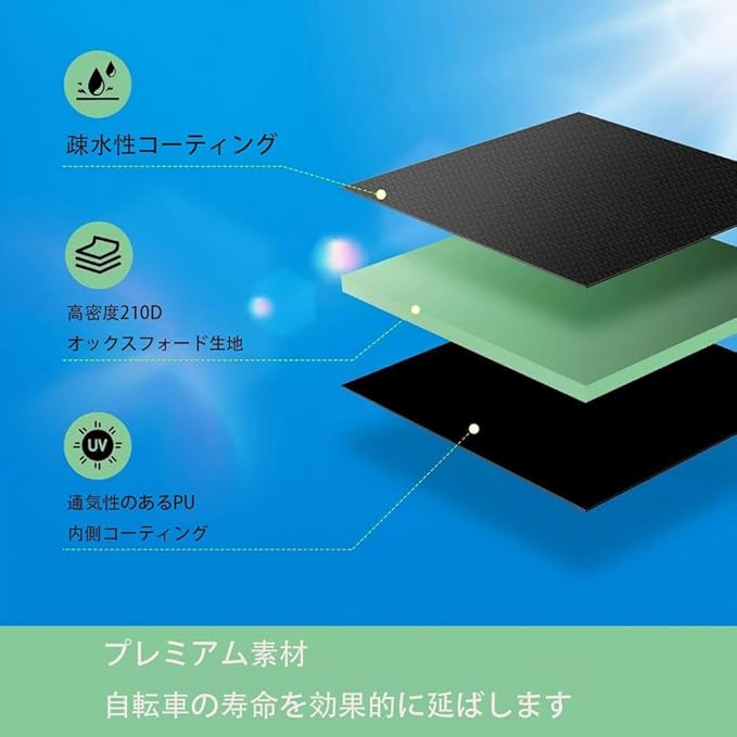 生地の特徴 - 自転車カバーは、疎水性コーティング、PU 防水コーティング、紫外線防止コーティングを組み合わせた 210D 生地を使用しており、自転車をしっかりと保護するための 3 つのコア テクノロジーを備えています。生地の厚みはわずか80GSM(g/m )ですが、多層構造により最大3000mmH₂Oの耐水圧を実現。耐水性、丈夫さ、軽量性のバランスに優れています