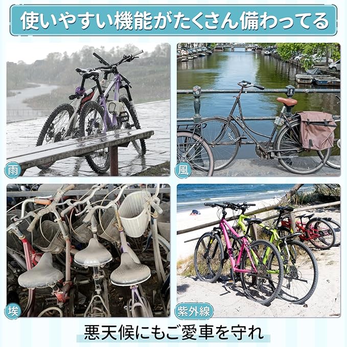 【撥水性抜群 紫外線カット】2倍の撥水加工、UVカットのシルバーコーティングが施されて、紫外線を90%カットし、日焼けから自転車をしっかりと守れます。
