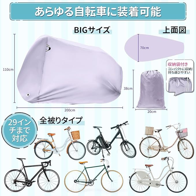 【29インチまで対応】自転車全体を覆う全被りタイプ、ロードバイク、マウンテンバイク、クロスバイク、ピストバイクマウンテンバイク、ミニベロ、電動自転車など、29インチまでの車種に対応可能です。