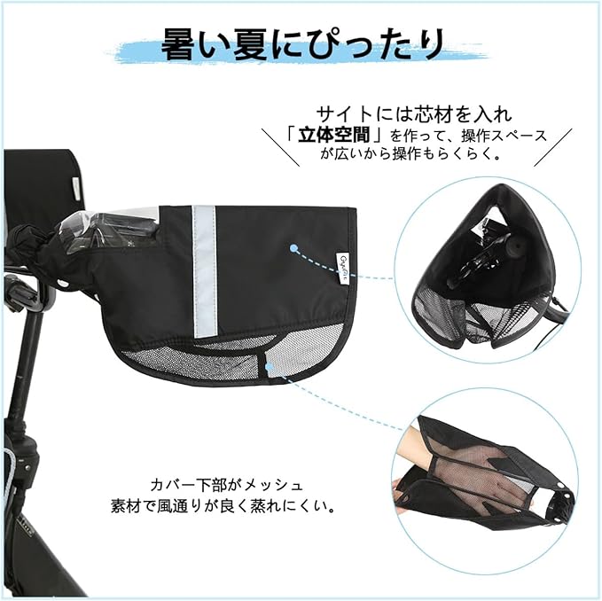 自転車 ハンドルカバー 防水 日よけ 夏向け 涼しい メッシュ UVカット しっかりフィット 強撥水 反射帯バイアス 電動アシスト自転車対応 雨よけ GyuPit