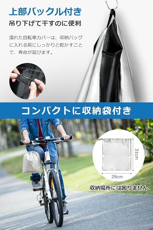 【風飛び防止のサイクルカバー】前後の底部には伸縮性のゴムがついており、簡単に着脱できます。さらに、風によるズレを防ぐための調整可能な防風バックルも前面に装備されています。強風や台風の日でもしっかりと自転車を守り、安心してご使用いただけます。風による飛散防止機能が強化されており、より安心して使えるサイクルカバーです。
