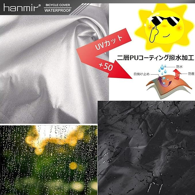 【高い撥水効果&UV加工】撥水加工の効果は通常の2倍、40+UVカットとシルバーコーティングでカバーや自転車本体の劣化の原因となる紫外線を反射して大幅にカットします。UV加工を施している自転車かばーで、より強い糸を使用しているため紫外線にも強く、しっかりと自転車を守ってくれます。それに、風の侵入を防ぎバタつきを抑え、雨、雪、ほこり、ゴミ、摩擦などから最小限に抑えることができます。