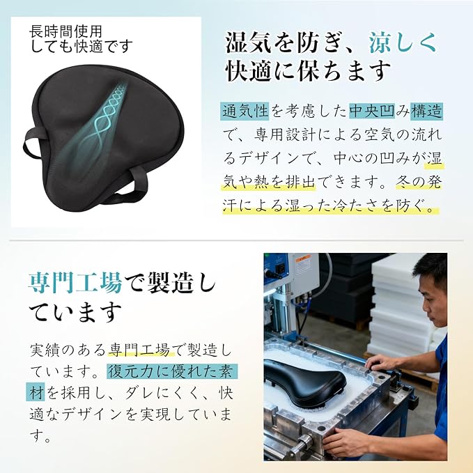 【抜群の通気性で蒸れを防ぐ】 サドルカバーの密着による蒸れを考慮し、側面にメッシュ素材を使用。同時に中央に溝(又は凹み)構造を設けて空気流通スペースを確保し、抜群の通気性を実現するため、長時間乗車してもお尻の蒸れを心配する必要がない。