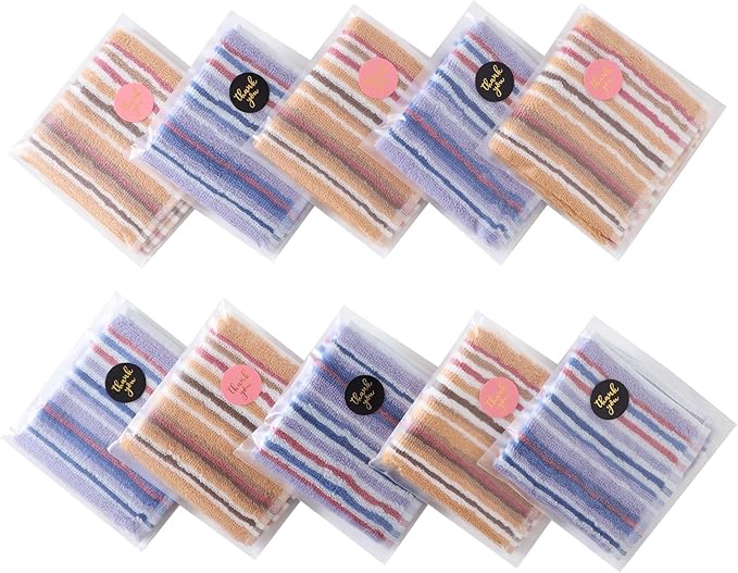 ハンカチ タオルセット お礼 個包装ギフトパッケージ 10枚入り 20x20cm ハンドタオル コットン100% ミニタオル 無撚糸 色柄お任せ ふわふわ 通学 通勤 景品 プレゼント 贈り物 プチギフト (ストライプ, ブルー5枚+オレンジ5枚)