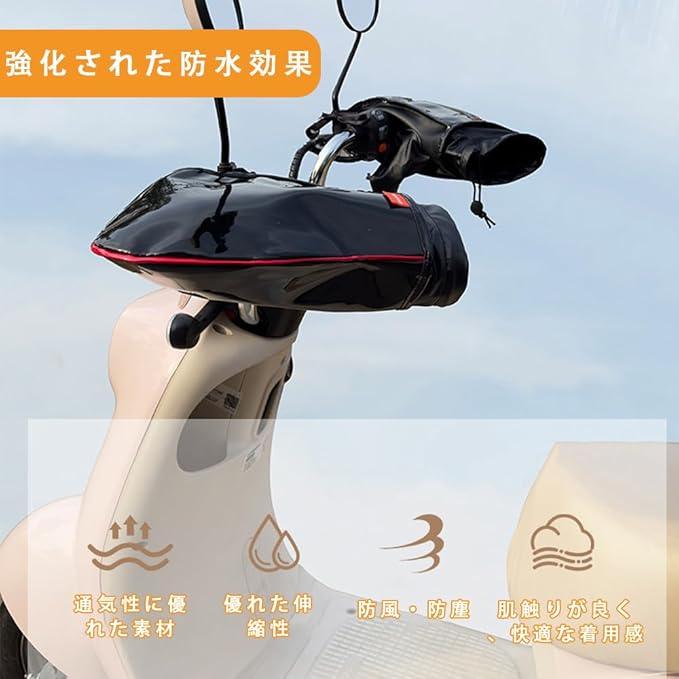 ️ 【防水設計】長めの袖口裏地と調整可能な締め付け装置を組み合わせ、雨水の浸入を効果的に遮断。PU表面素材とブレーキレバー専用雨よけが立体的な防水バリアを形成し、様々な走行環境に対応。