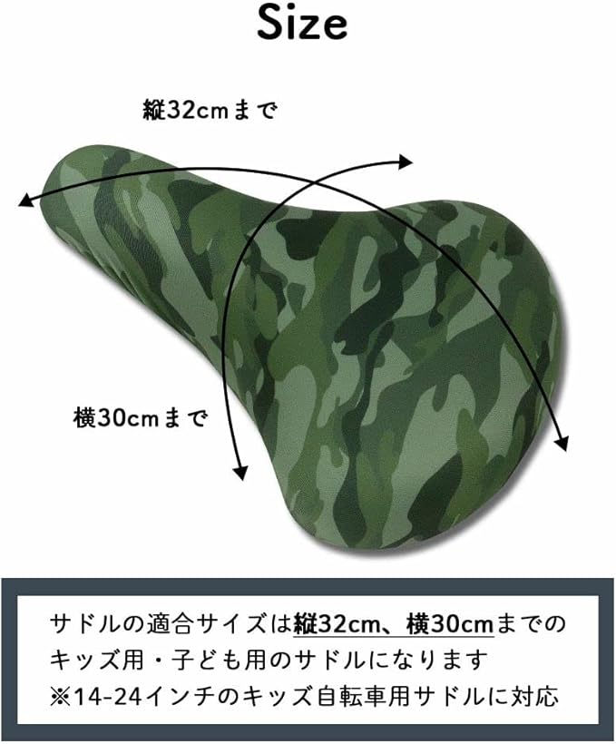 サドル適合サイズは縦32cm・横30cmまでのキッズ用・子ども用のサドル(14-24インチのキッズ自転車用サドルに対応)