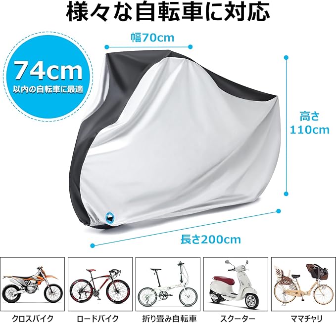 【大きいサイズ・持ち運びに便利】立体裁断と絞りゴムにより、風の侵入を防止、自転車をすっぽりと覆い被せます。大きめサイズ:約200cm x 110cm x 70cm。29インチまでの自転車や27インチまでのバイクに対応可能です。また、サイクルカバーと同じ高級素材を使用した収納袋も付属しており、使用しない時や持ち運ぶ時は専用収納袋にコンパクトに収納できます。