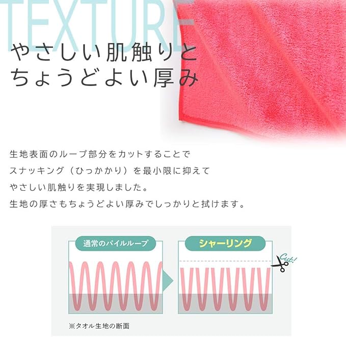 生地表面のループ部分をカットすることで、スナッキング(ひっかかり)を最小限に抑えてやさしい肌触りを実現しました。生地の厚さもちょうどよい厚みでしっかりと拭けます。