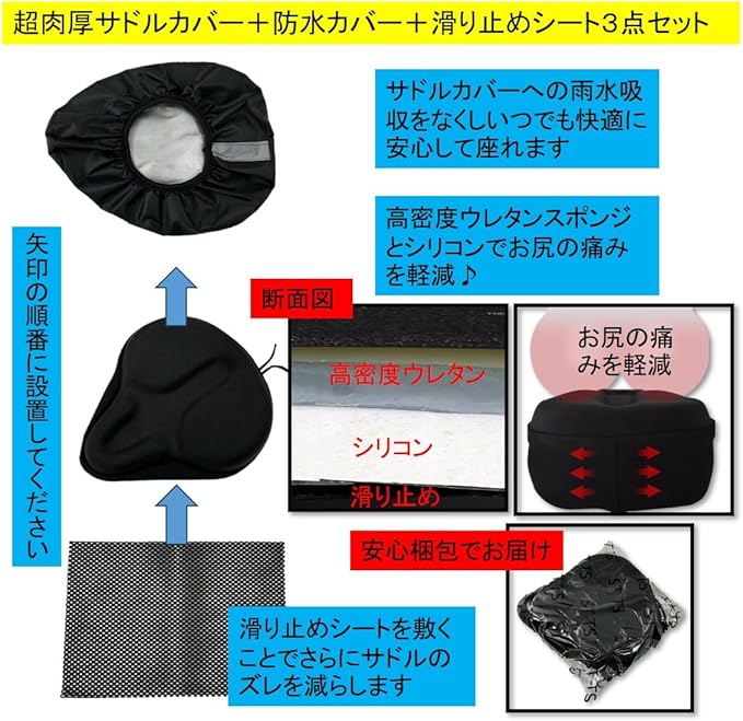 【肉厚タイプ30㎝ 27㎝ 3㎝】自転車 【肉厚サドルカバー+滑り止めシート+防水、防水反射カバー】3点セット販売!