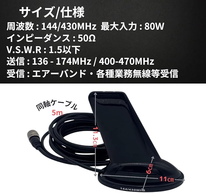【仕様】周波数:144/430MHz / 最大入力:80W / インピーダンス:50Ω V.S.W.R::1.5以下 / 送信:136-174MHz / 400-470MHz / 受信:エアーバンド・各種業務無線等受信可