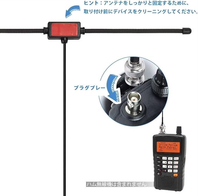 周波数範囲: 20MHz - 1300MHz; 対応機種: スキャナー、アマチュア無線、双方向無線、トランシーバー、移動無線; VSWR: <2.0; インピーダンス: 50Ω; 特徴: カーウインドウガラスのり取り付け; ケーブル長: 3m; アンテナコネクター: BNCオスコネクター;