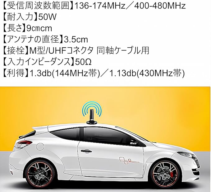 ① 144MHz帯と430MHz帯に対応したデュアルバンド仕様で、モービル通信の幅を広げられるアンテナです。アマチュア無線、航空無線受信、業務無線など多様な運用環境で活躍し、効率的な送受信を実現します。交換用アンテナとしても導入しやすい実用性を備えています。