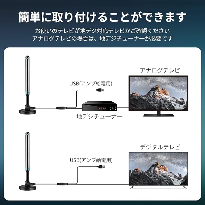 【簡単セットアップ、工具不要】プラグアンドプレイで簡単にセットアップできます。 アンテナを窓の近くに置いて受信を良くし、必要に応じて位置を調整します。