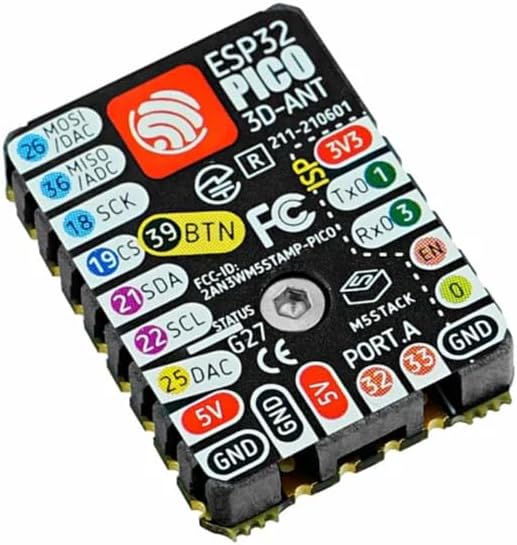 ●電源:DC5V ●消費電流:最大500mA ●SoC:ESP32-PICO-D4 ●CPU:デュアルコア Tensilica LX6 CPU、最大240MHz(600DMIPS) ●RAM:520KB ●フラッシュメモリ:4MB ●Wi-Fi:2.4GHz(IEEE 802.11b/g/n) ●Bluetooth:4.2 (Bluetooth Low Energy対応) ●搭載デバイス:RGB LED、押しボタンスイッチ ●重量:2.6g ●サイズ:18 24 4.4mm