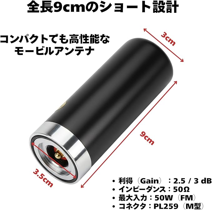 After7 モービル 用 ショート ミニ アンテナ 9cm デュアルバンド 136-174 / 400-470MHz 最大 50W 対応 PL259 M型 コネクタ 車載 無線機 低背タイプ アマチュア 無線