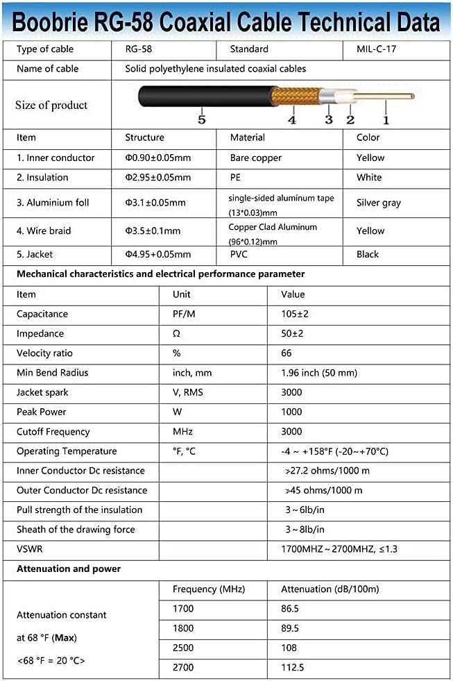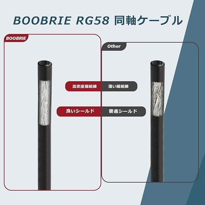 ✿BOOBRIE RG58同軸ケーブルは、96*0.12MM編組銅線を使って、良い導電性と伝送効果を持って、性能と実用性から、コストパフォーマンスが高いです。