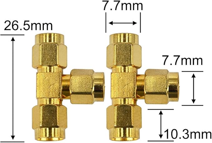商品説明: コネクタタイプ:SMAオスからSMAメスへの3方向、ピンから穴へ カラー:ゴールドメッキ 材質:金属 オスジャック内径:7.49mm (手動測定、0.1-0.3mmの誤差を許容) 絶縁抵抗:≥5000Mオーム 絶縁電圧:1000V 接触抵抗:中心導体≤3.0; 外部導体≤2.0 コネクタの耐久性:500サイクル 周波数範囲:0-6GHz インピーダンス:50オーム