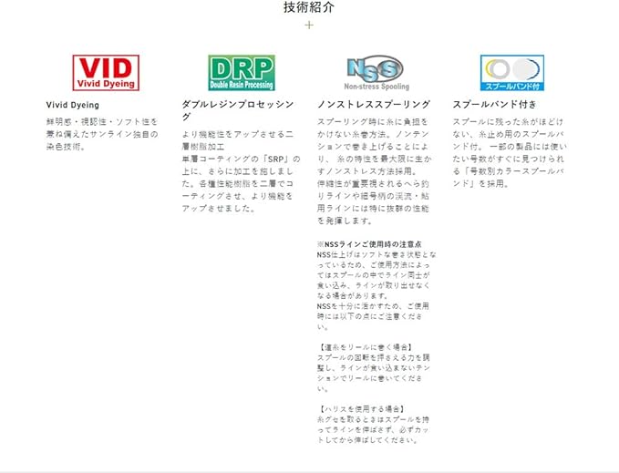 搭載機能: 「VID(Vivid Dyeing/染色技術)」 「DRP(ダブルレジンプロセッシング/二層樹脂加工)」 「NSS(ソフト巻き状態/糸巻方法)」 「スプールバンド付」