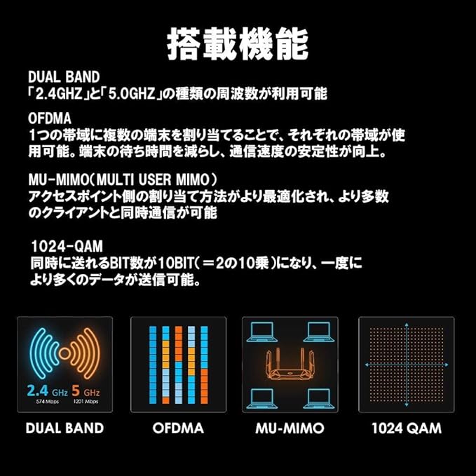最大1800Mbpsのスピードでノートパソコンやデスクトップパソコンでも高速通信が可能