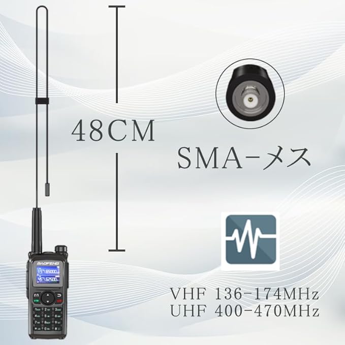 [情報] 長さ:8.9INCH/48cm 周波数範囲:VHF 136-174MHz; UHF 400-470MHz インピーダンス:50 ohm コネクタ:SMA-メス ホイップアンテナ